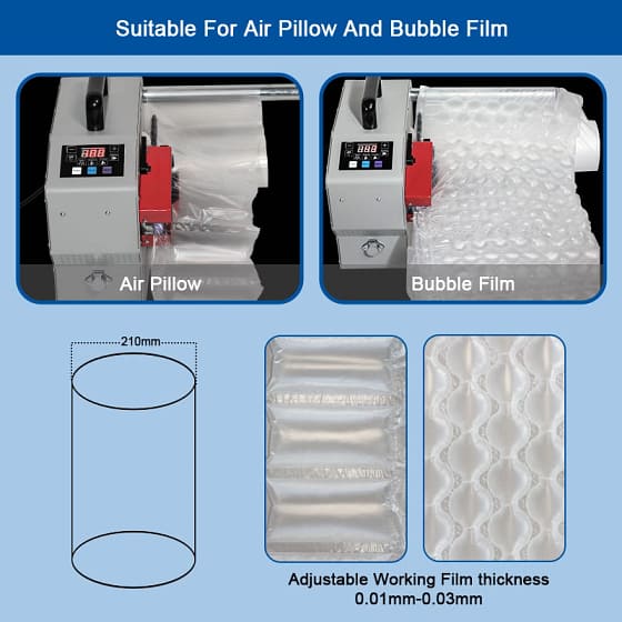 - Easy Operation: It’s easy-to-use, requiring no professional training. The machine can automatically select film settings for air pillows, bubble packaging, and inflatable air cushioning, ensuring high packing productivity.