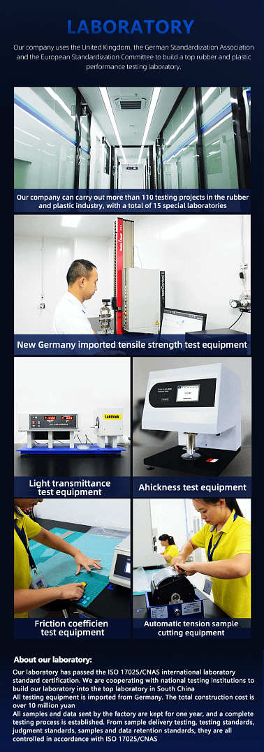 | ISO 17025/CNAS Laboratory | Our in-house lab (equipped with German-imported testing equipment) conducts 110+ rubber/plastic performance tests (tensile strength, light transmittance, friction coefficient) — ensuring consistent quality. |