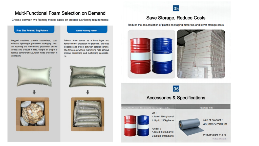 It produces polyurethane foam on demand that perfectly conforms to product shapes, providing superior protection for electronics, precision instruments, fragile goods, and industrial components.